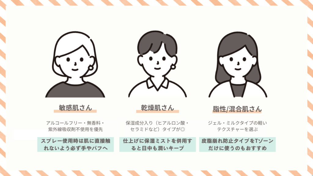 スプレー | 手軽で広範囲に塗れる | 顔に直接はNG/ムラが出やすい | 首・髪・腕などの外出前や屋外 |